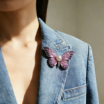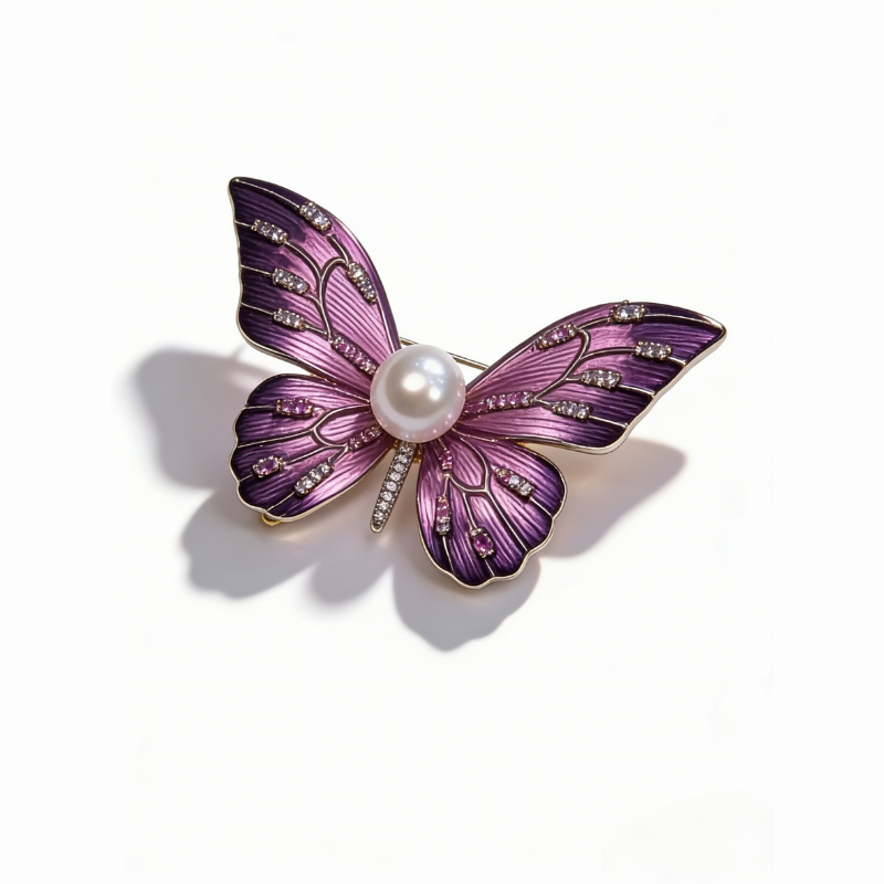 Luxury butterfly brooch with faceted obsidian crystal wings and a lustrous freshwater purple pearl centerpiece, set in a dark metal frame