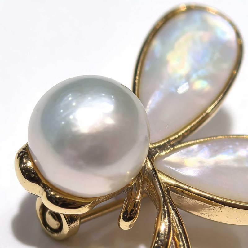 Delicate dragonfly brooch with a lustrous freshwater pearl body and iridescent mother-of-pearl wings, set in a gold-toned metal frame.