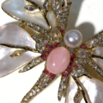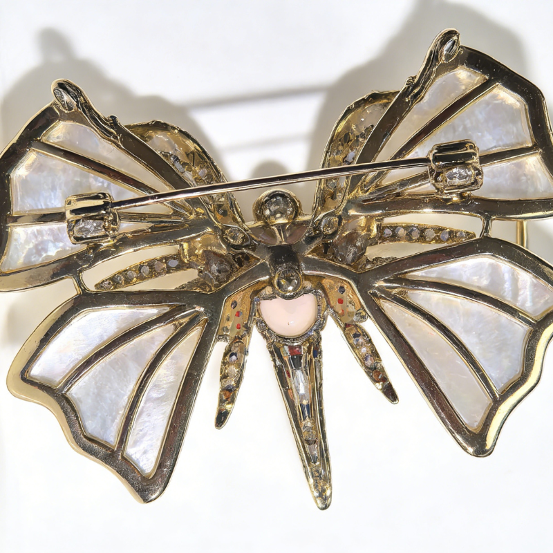 A couture-like floral brooch crafted with luminous mabe mother-of-pearl petals, framed in a polished gold-tone silhouette and finished with sparkling accent stones. At the center, a soft pink cabochon brings warmth, while a delicate pearl detail adds a refined focal point.