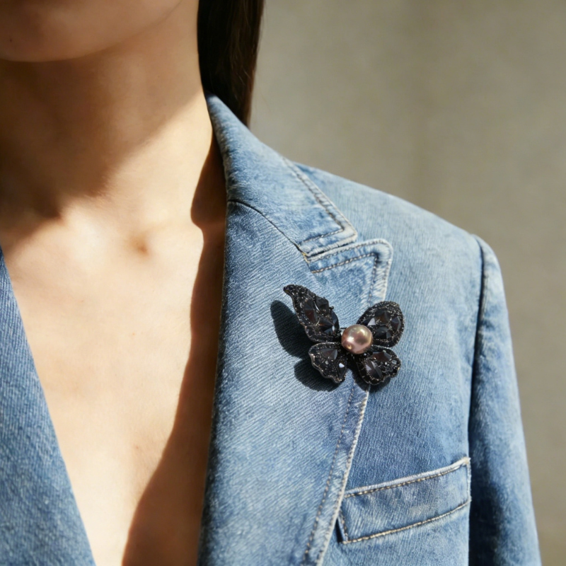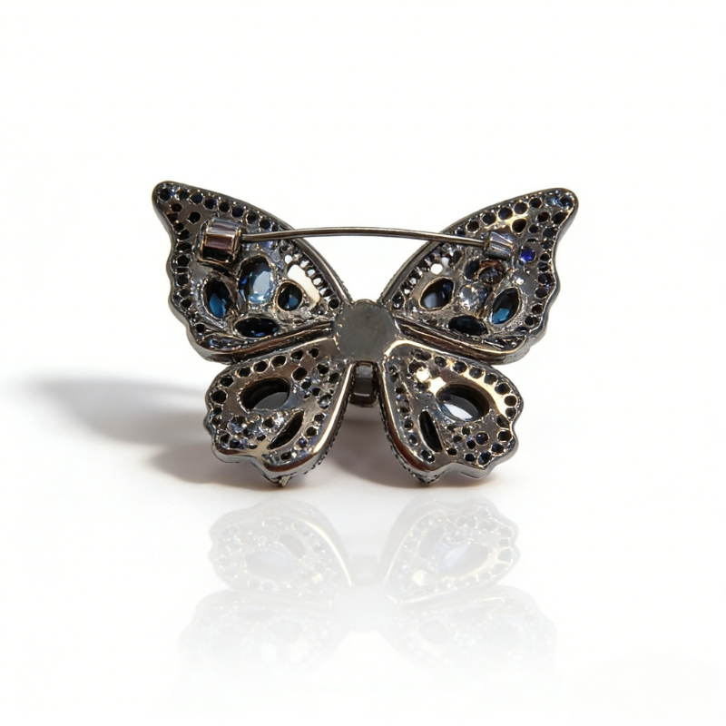 Silver CZ butterfly brooch with mother-of-pearl wings on white background Close-up of cubic zirconia pavé and blue accents Detail of mother-of-pearl wing iridescence Brooch pinned on blazer lapel, styling reference